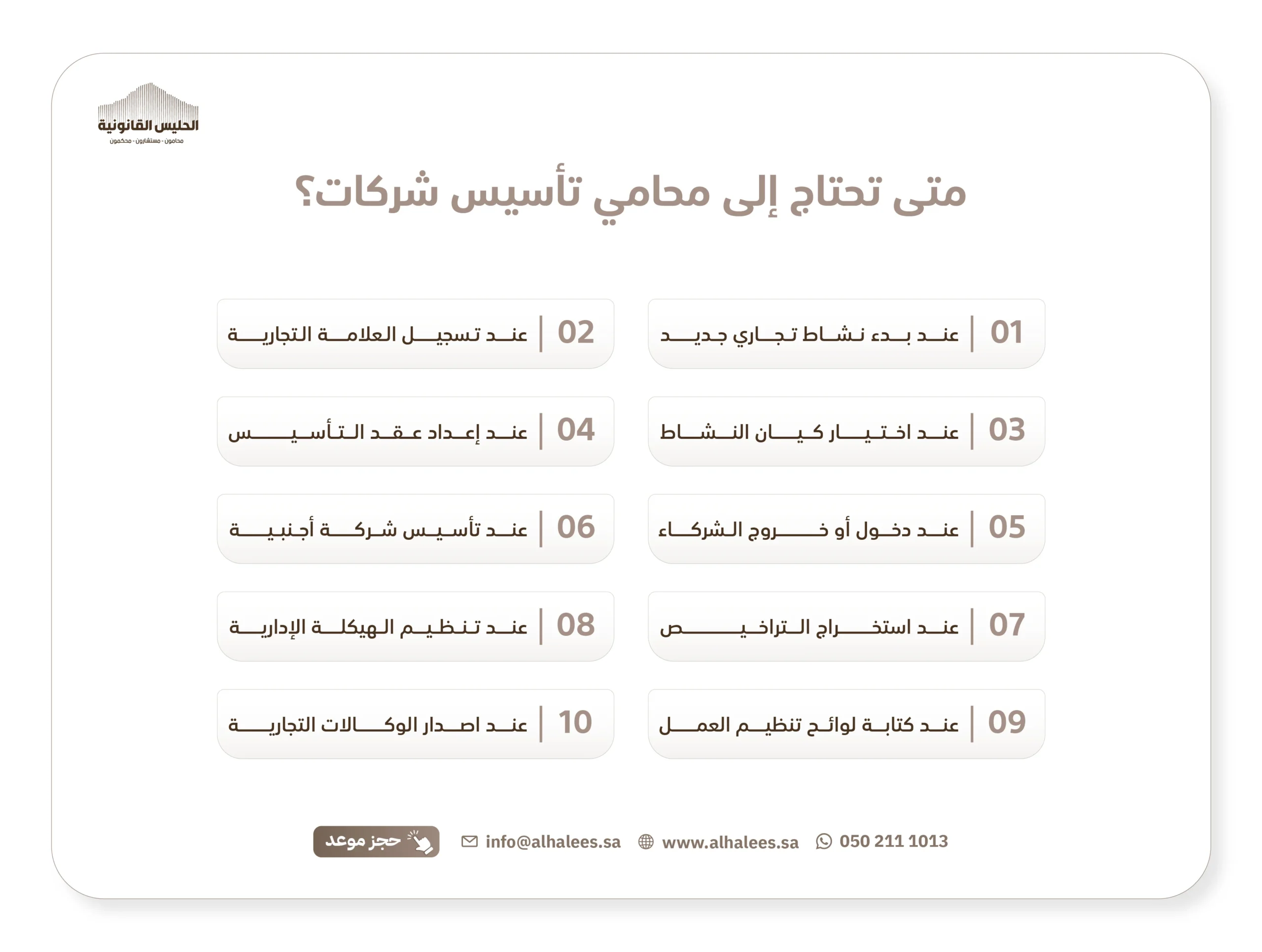 في شركة عبدالرحمن منصور الحليس القانونية، نضع خبرتنا الطويلة وفريقنا المتميز في خدمتك، لنكون شركاء نجاحك منذ اللحظة الأولى، سواء كنت تخطط لتأسيس شركة في السعودية، أو تحتاج إلى صياغة عقود، أو استشارات قانونية متخصصة، نحن هنا لتقديم الدعم الكامل بأعلى معايير الجودة والمهنية.