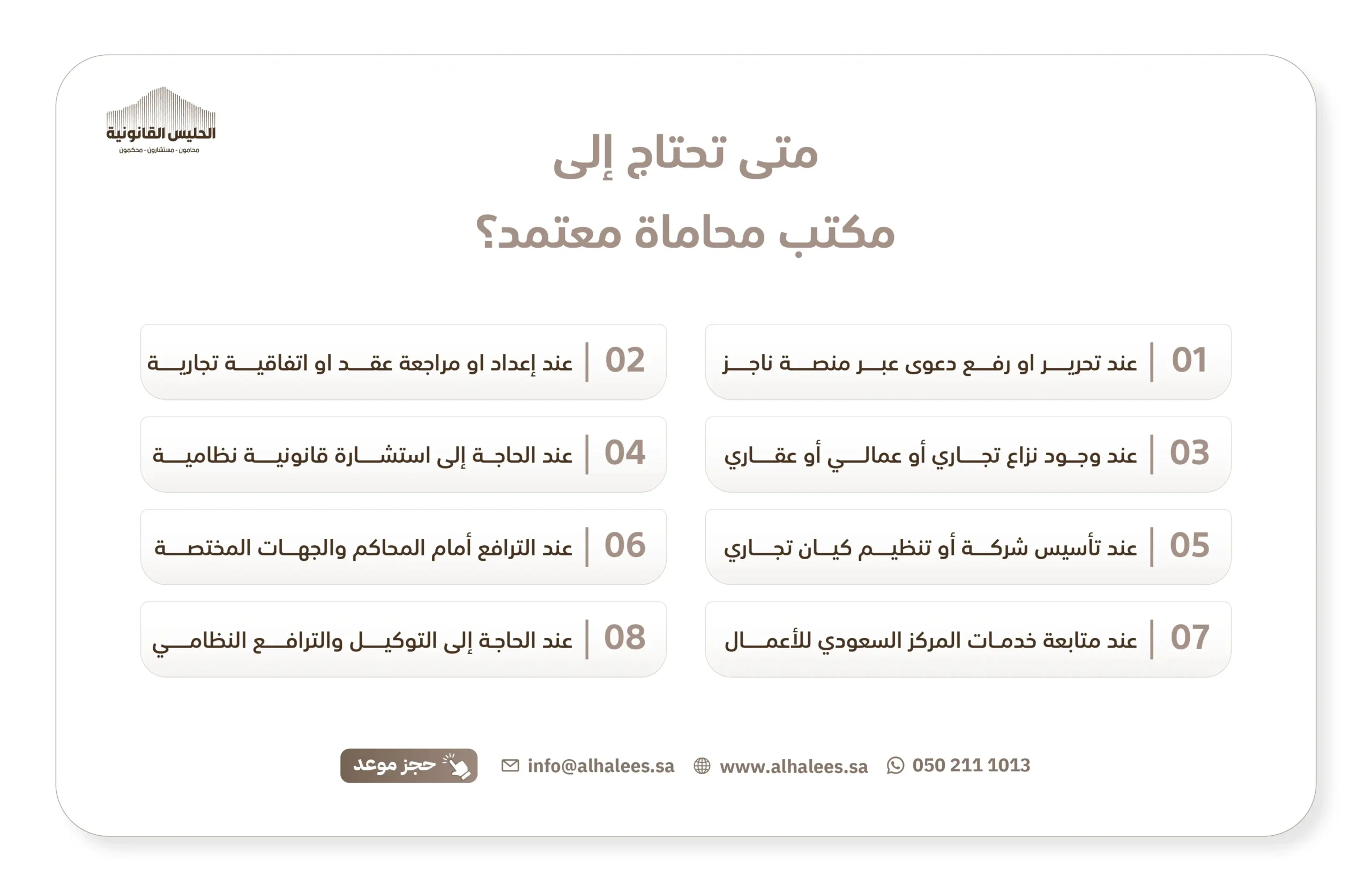 اختيارك لشركة الحليس كمكتب محاماة معتمد هو اختيار للأمان، والدقة، والاحترافية.